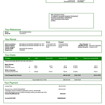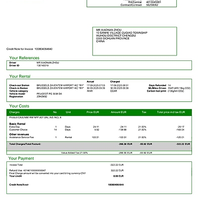 取车时告知我们预定的车和同类型的都没有了,然后就要求我们加钱租更贵的车 从7点过一直办理8点53分左右 最后在我们要求下 把租车时间改到了8点53分。无赖之下只能加钱租更贵的车,但是车子满身伤痕,在开出去后到达第一个城市布鲁塞尔又发现 雨刮器没有水 我们到加油站加了水也不能使用,然后不够50公里 柴油车的AdBlue也不够了(明显是工作人员忘记加了)然后我们又去找卖这个的店铺,最后花了20欧元自己购买。然后在还车时 验车的老外态度非常恶劣 所以我们没有签字,然后找到柜台值班的工作人员,最后经沟通 值班人员说他帮忙已经解决 他帮忙签字了 没有问题了就让我们走了。但是今天收到扣费金额为 378.85美金 完全在乱扣费!此事不能得到妥善的处理 我将请律师维权。租车体验极其差,影响我们整体租车体验。作为你们的老顾客 极其失望!!